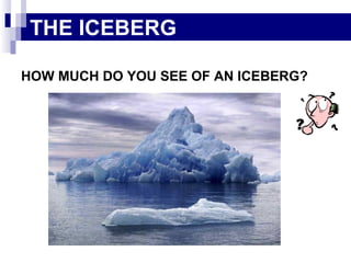 The document discusses how attitude is a major factor in one's life and success. It compares a person's attitude to an iceberg, with most of it lying below the surface and unseen. One's attitudes, beliefs, values and motives shape their behavior more than their visible knowledge and skills. Having a positive attitude can help one achieve more in life than having a negative one. The document provides quotes about the importance of maintaining a positive attitude and outlook.