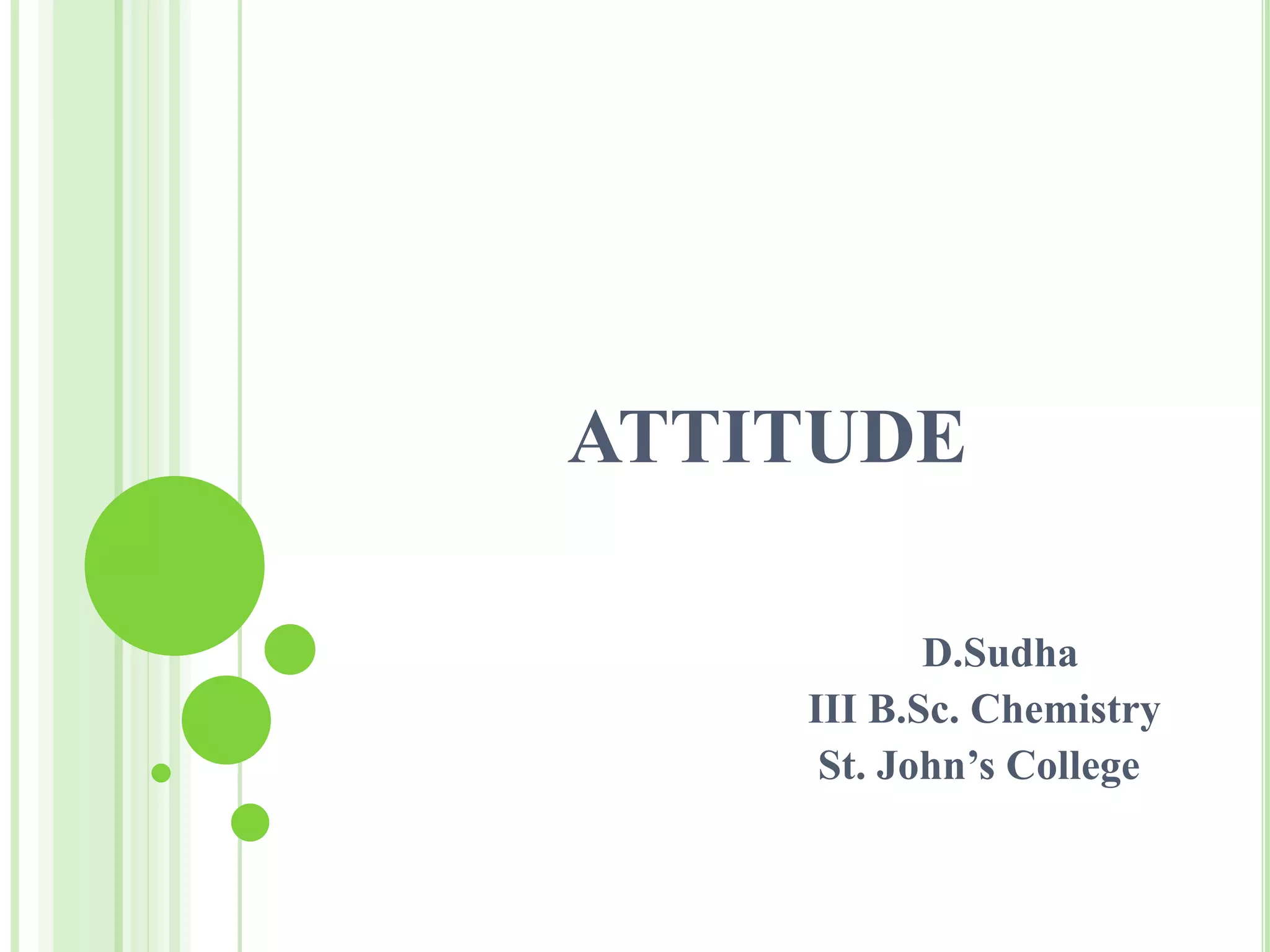 This document discusses attitude, including its definition, components, formation, types (positive and negative), how to develop a positive attitude, and methods to change attitude. It defines attitude as a persistent tendency to feel and behave in a particular way towards objects, events or persons. The three components of attitude are cognitive (beliefs), behavioral (intentions), and affective (feelings). Attitudes are formed through experience, association, family, and society. Positive attitudes help see opportunities and solve problems, while negative attitudes only see failures and threats. Methods to change attitude include providing information, influencing with friends, and using fear at a moderate level.