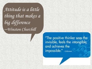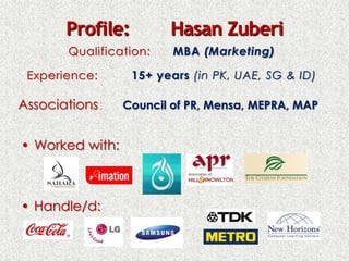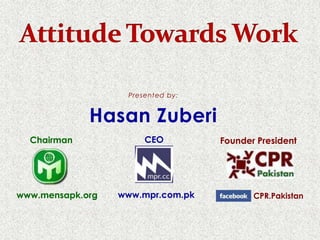 This document summarizes the qualifications and experience of Hasan Zuberi. It lists that he is the Chairman, CEO, Founder and President of mensapk.org and mpr.com.pk. He has an MBA in Marketing and over 15 years of experience working in Pakistan, UAE, Singapore, and Indonesia. He is also associated with several professional councils and organizations related to public relations and marketing. The bulk of the document then focuses on defining a positive attitude towards work and how attitude determines one's career success. It emphasizes having the right combination of pride, passion, belief, skills, knowledge, and taking action.