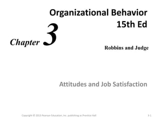 The document discusses attitudes and job satisfaction. It defines the three components of an attitude as cognitive, affective, and behavioral. Attitudes predict behavior but this relationship is influenced by several variables. The major job attitudes are discussed and compared, including job satisfaction, involvement, commitment, support, and engagement. Job satisfaction is defined and methods for measuring it are presented. The main causes of job satisfaction are summarized, including pay, the work itself, relationships, growth, and personality factors. Finally, four employee responses to dissatisfaction are identified.