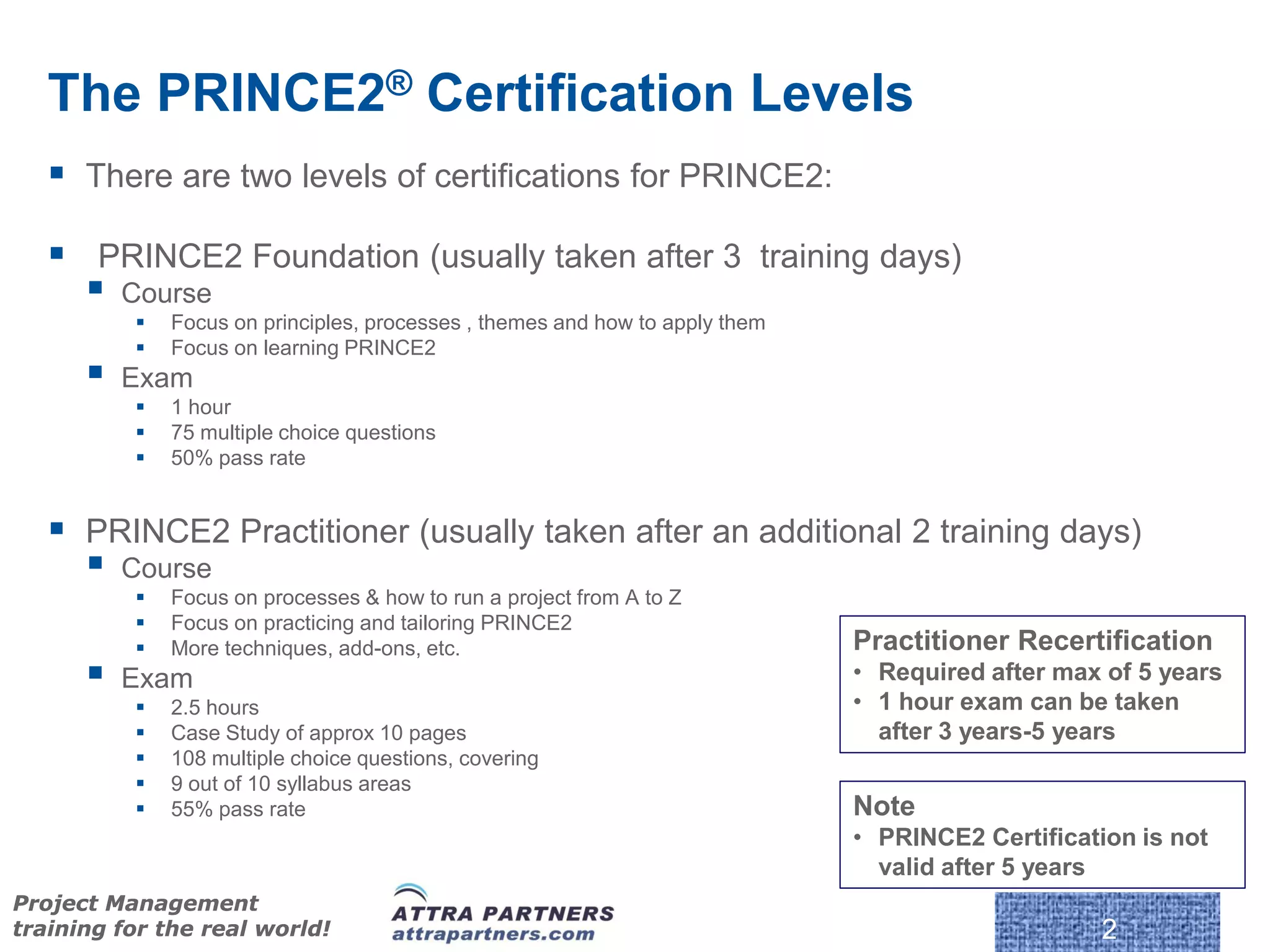 PRINCE2 is a methodology for project management that consists of principles, themes, and processes. There are two levels of PRINCE2 certification - Foundation and Practitioner. The Foundation certification focuses on learning the principles and processes, while the Practitioner certification focuses on applying PRINCE2 to run a project. PRINCE2 provides structure for project management through its principles, themes, and defined processes but does not cover specialized or interpersonal skills.