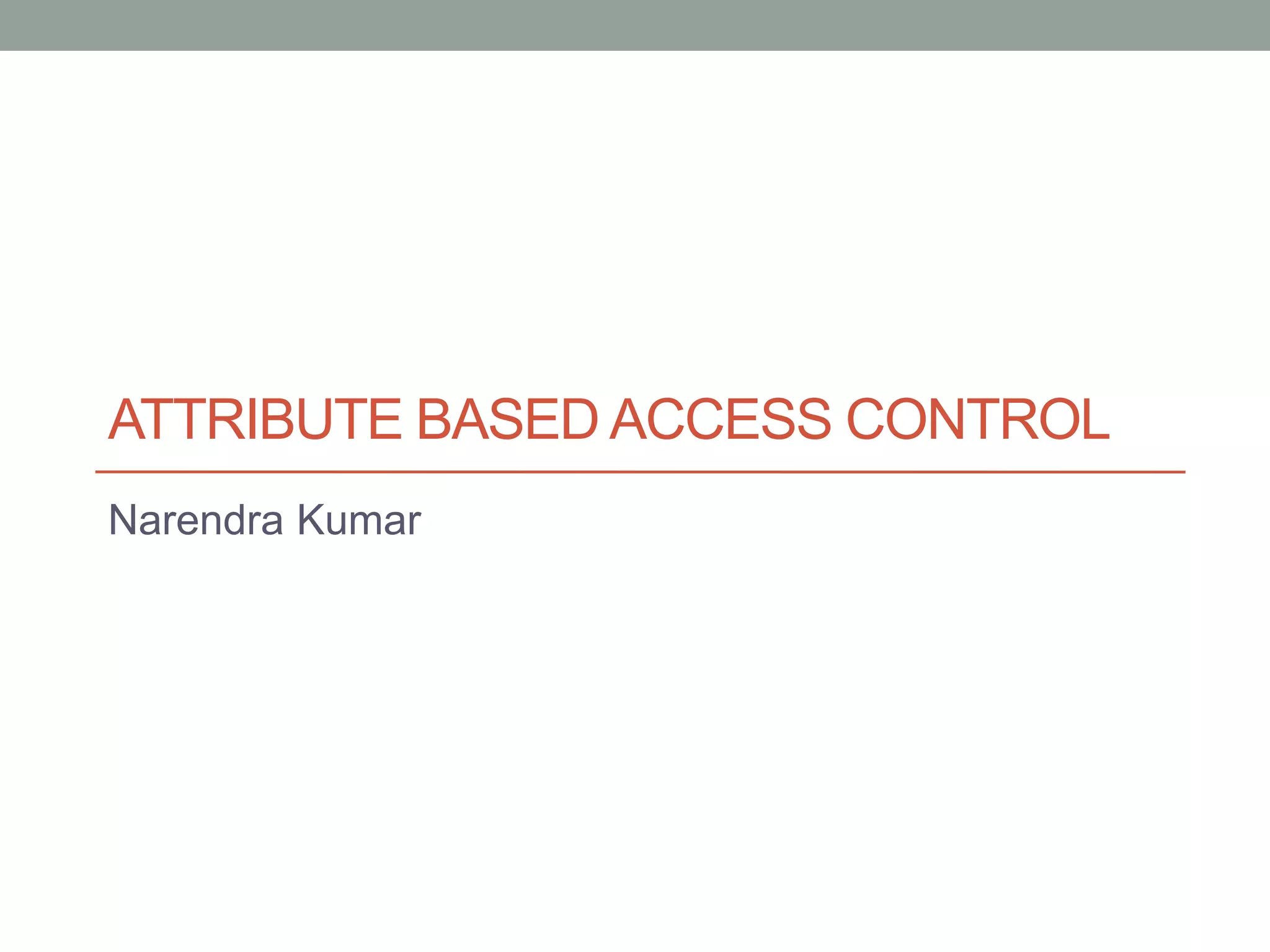 Attribute-Based Access Control (ABAC) is a model where access rights are granted to users based on policies that incorporate various attributes, such as user, resource, and environmental attributes. The architecture includes a Policy Enforcement Point (PEP), Policy Decision Point (PDP), and Policy Information Point (PIP) that interact to evaluate access requests and apply rules. Implementation of ABAC often utilizes standards like XACML and available open-source tools, such as AuthzForce and Balana.