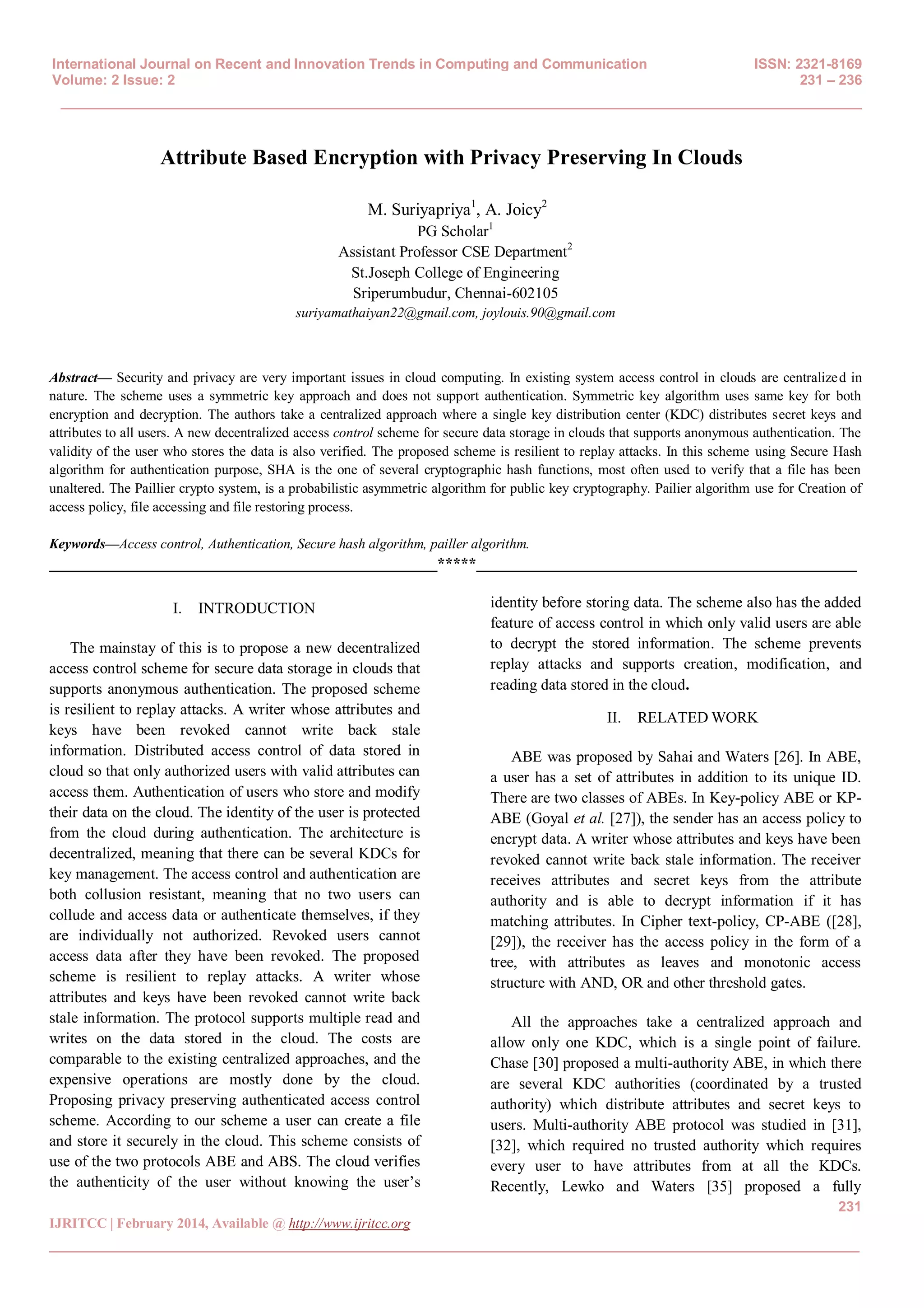 This document proposes a new decentralized access control scheme for secure data storage in clouds that supports anonymous authentication. The key points are: