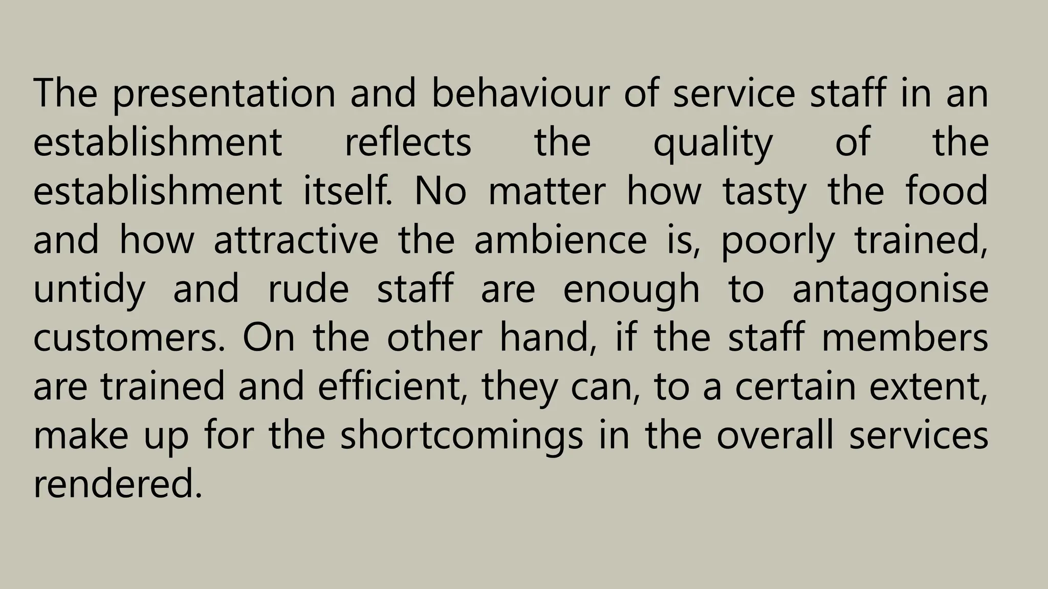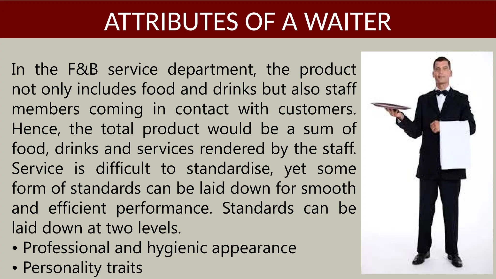 The document outlines essential attributes and standards for waiters in the food and beverage service industry, emphasizing the importance of personal hygiene, conduct, and service skills. It highlights that professional appearance and soft skills, along with responsibilities such as memory and observation, are crucial to enhance customer experience. Additionally, it stresses the need for waiters to maintain punctuality and possess local knowledge to effectively assist guests.