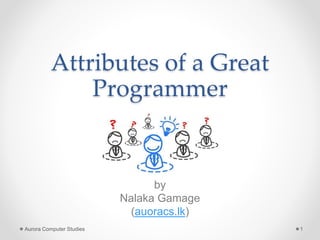 This document lists the attributes of a great programmer, including logical thinking, problem solving skills, an analytical mind, intelligence, engineering mindset, simplicity in solutions, concentration, patience, knowledge management skills, ability to learn new things, teamwork, humility, willingness to help others, and celebrating success. It emphasizes the importance of continually improving excellence through habit. The document was presented by Aurora Computer Studies and provides contact information.