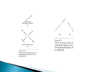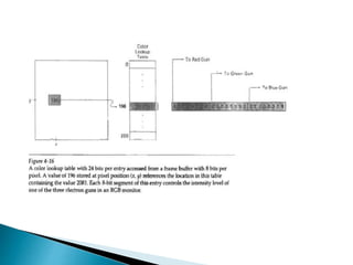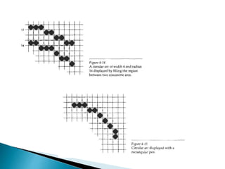 This document discusses various attributes that can be used to modify the appearance of graphical primitives like lines and curves when displaying them, including line type (solid, dashed, dotted), width, color, fill style (hollow, solid, patterned), and fill color/pattern. It describes how these attributes are specified in applications and how different rendering techniques like rasterization can be used to display primitives with various attribute settings.