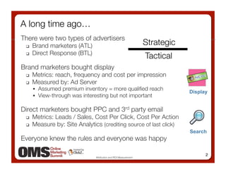 The document discusses the evolution of digital advertising and the importance of measuring attribution and ROI, emphasizing that brand marketing and direct response are merging. It outlines a five-step roadmap for effective measurement, including defining objectives, actions, metrics, translating results into value, and communicating effectively to stakeholders. Challenges in measurement, particularly in attributing credit and calculating offline impact, are highlighted along with potential solutions and methodologies.