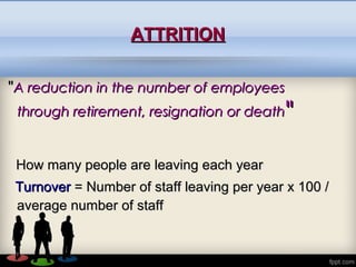 This document discusses attrition and measures to control it. It defines attrition as the reduction of employees through retirement, resignation or death. It provides the formula to calculate attrition rate and examples. The business process outsourcing sector faces high attrition rates around 55% due to causes like lack of career growth, low salaries, and stressful work. Strategies to improve retention include incentives, training programs, flexible policies, and career counseling. The conclusion states the outsourcing industry may face staff shortages if attrition rates are not reduced from the current high levels of 50-60% to 10-15% through improved recruitment planning.