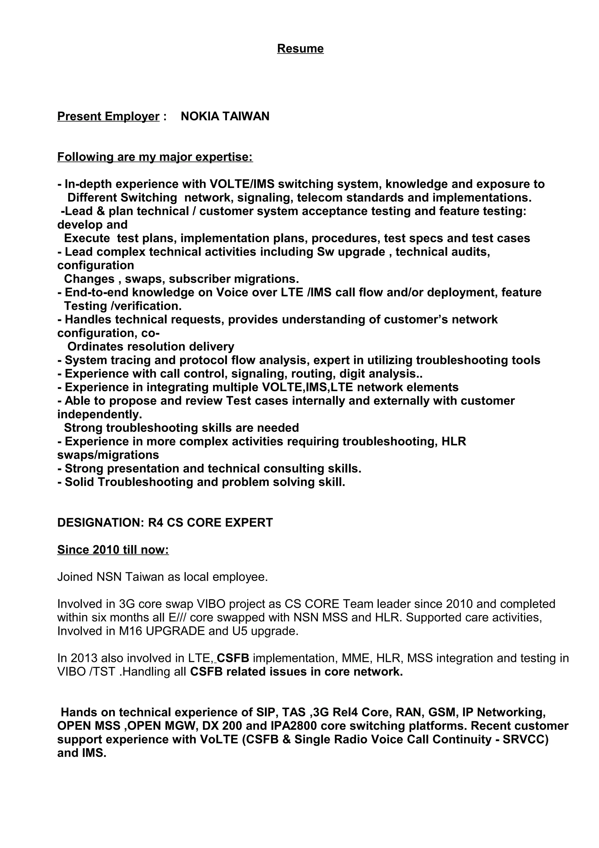 - Over 15 years of experience in 3G core networks including VOLTE, IMS, LTE, MSS, HLR and testing. Specializes in CS core networks.