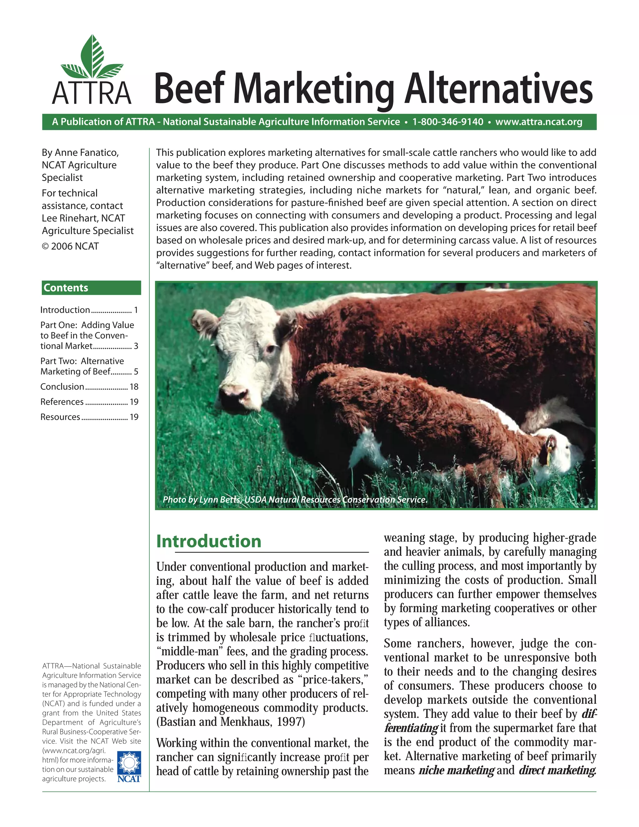 This document discusses methods for cattle ranchers to add value to their beef within and outside of the conventional beef marketing system. It explains that ranchers can increase profits within the conventional system by retaining ownership of cattle past weaning, producing higher quality cattle, and forming marketing cooperatives. The document also introduces alternative marketing strategies such as niche markets for natural, lean, or organic beef which involve direct marketing to connect producers with consumers seeking differentiated products. It provides an overview of production and marketing considerations for ranchers interested in alternative beef marketing.