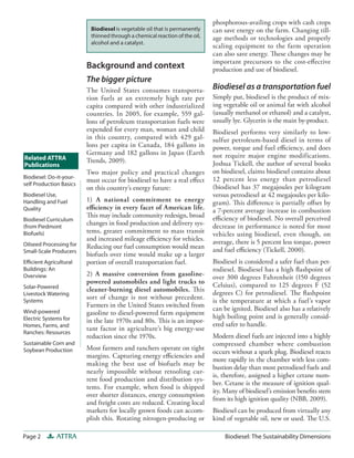 This document discusses the sustainability dimensions of biodiesel production and use. It provides background on biodiesel, noting that it offers environmental and economic benefits but production is limited by available farmland and feedstocks. The document surveys qualities of biodiesel like its cloud point compared to petrodiesel, and feedstocks like waste vegetable oil and soybean oil. Key sustainability considerations discussed include the energy balance of biodiesel, linking bioenergy crop production to sustainable practices, and the economics of scale and consumer access to biodiesel.
