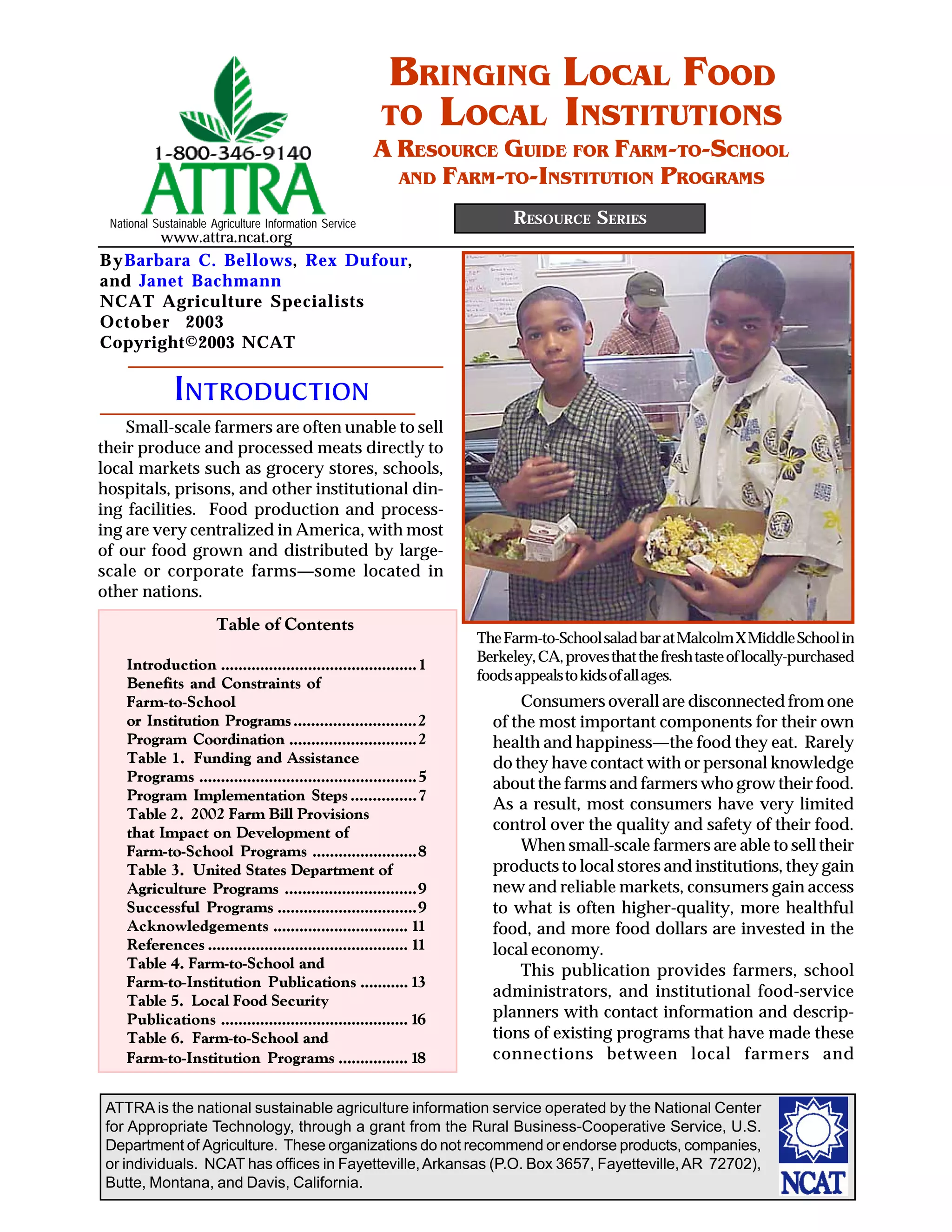 This document summarizes a resource guide for farm-to-school and farm-to-institution programs. It discusses how such programs can benefit both small-scale farmers and local institutions by providing new markets for farmers' products while giving institutions access to higher-quality, local food. However, it also notes constraints faced by both farmers and institutions in establishing these connections. It then provides an overview of different coordination and distribution systems that have been used successfully in existing programs. These include farmers' cooperatives, nonprofit organizations, wholesalers, farmers' markets, state government agencies, and partnerships with the U.S. Department of Defense procurement program. The document aims to help more communities initiate similar local food programs.