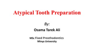 This document discusses atypical tooth preparations that are needed in certain clinical situations. It describes preparations needed for malaligned teeth, short teeth, mutilated teeth, periodontally compromised teeth, and endodontically treated teeth. For each situation, guidelines are provided for modifying the classic tooth preparation to address the specific problems presented while still providing adequate retention and resistance form. Endocrowns are also discussed as an alternative treatment for teeth with complete loss of the clinical crown where traditional post-and-core rehabilitation is not possible.