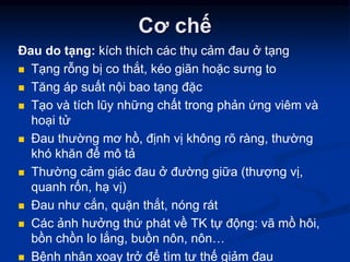 Tài liệu mô tả cơ chế và phân loại đau bụng cấp, bao gồm đau do tạng, đau do lá thành và đau liên quan. Đau có thể xuất phát từ nhiều nguyên nhân khác nhau như viêm, tắc nghẽn, thủng tạng, hoặc các vấn đề ngoại khoa và cần phải được đánh giá cẩn thận thông qua triệu chứng và khám lâm sàng. Việc phân tích đặc điểm của cơn đau, thời gian, vị trí và triệu chứng kèm theo rất quan trọng để chẩn đoán đúng nguyên nhân.