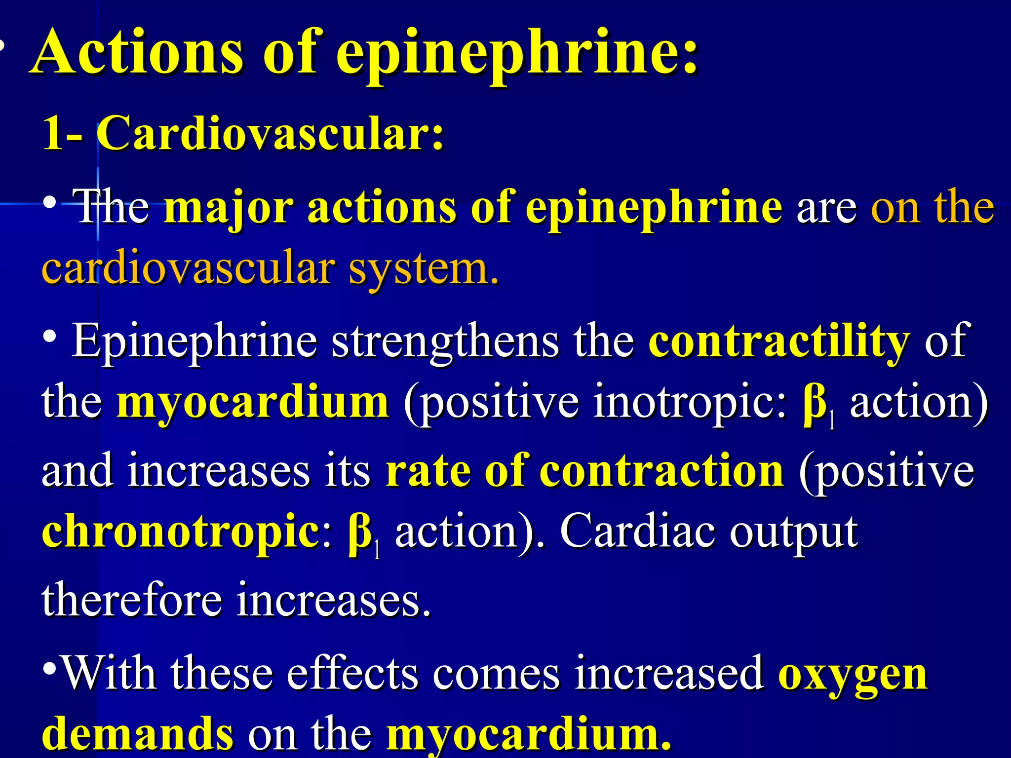 1. Epinephrine's main actions are on the cardiovascular system, where it increases heart rate, contractility, and cardiac output. It constricts vessels in skin and mucous membranes while dilating vessels to skeletal muscle.