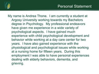 Andrea Thone is working towards obtaining her Bachelor's degree in Psychology from Argosy University. She has experience working in both a daycare center and a nursing home, gaining experience in child development and care of elderly individuals. Her educational and professional experiences have provided her with skills in areas such as communication, handling difficult situations, and understanding individual needs. Upon graduating, her goal is to obtain a career in the counseling or psychology field where she can continue learning and developing her skills to help others.
