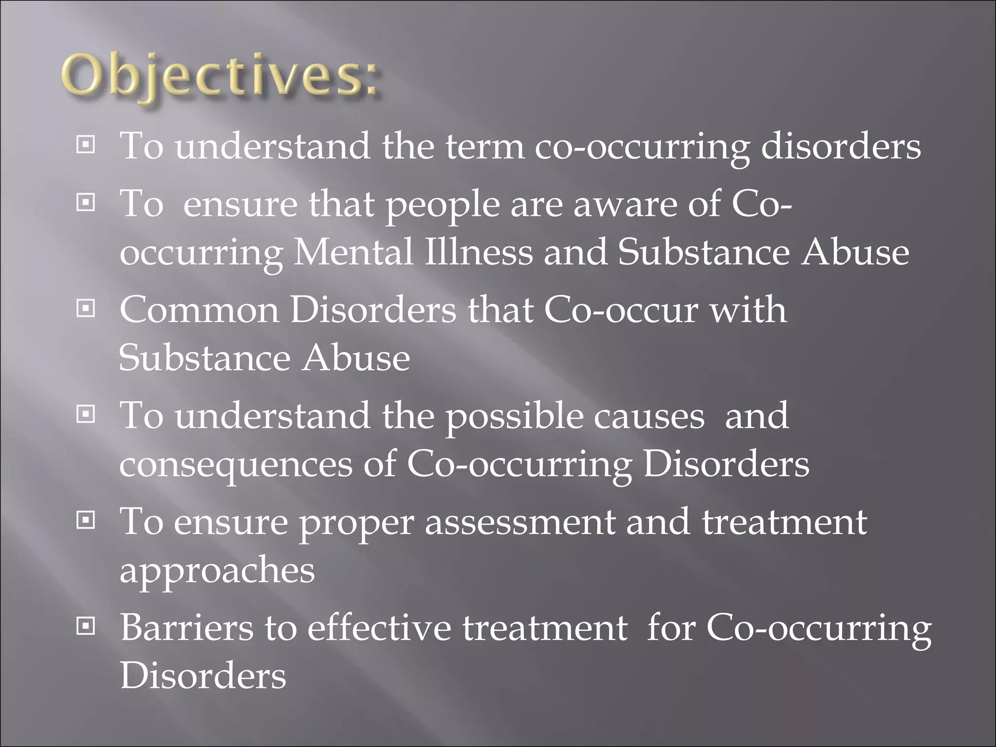 This document discusses co-occurring disorders, which are when an individual has both a mental illness and a substance abuse disorder. Approximately 50% of people with severe mental illness also have a substance abuse problem. Common disorders that co-occur include mood disorders like depression and bipolar disorder, as well as anxiety disorders. People may use substances to self-medicate their psychiatric symptoms. Effective treatment requires an integrated approach that addresses both disorders simultaneously.