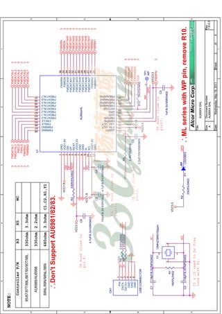 The document is a schematic for an AlcorMicroCorp AU69XXGHL controller. It includes a list of component designations and their corresponding specifications. Key components include the AU69XXGHL controller U1, crystal oscillator Y1, USB connector CN1, and flash memory chips U5-U6 which are Samsung DDR flash. The schematic provides guidance on component placement and values for optimal performance.