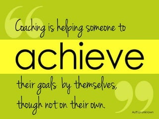 This document discusses coaching as an alternative to traditional management approaches. It presents a spectrum of helping relationships with coaching positioned between counseling and facilitating. Coaching differs from telling or training in that it does not import an expert model, but rather helps individuals find their own best solutions to problems that often lack single right answers. The document outlines a simple coaching model where the manager asks questions to help the learner explore options rather than giving direct advice. It also discusses key coaching skills like active listening and challenging feedback to help learners develop their own solutions.