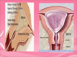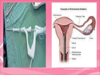 Abnormal uterine bleeding (AUB) refers to bleeding outside of normal menstrual periods. The document defines different types of AUB and classifications. It also discusses evaluation, causes such as structural issues or ovulatory dysfunction, treatment options including medications, intrauterine devices (IUDs), endometrial ablation, and hysterectomy. Dysfunctional uterine bleeding (DUB) is defined as AUB without identifiable organic or systemic cause, and is often due to irregular ovulation.