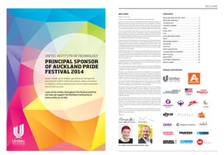 The document is a programme for the Auckland Pride Festival 2014, which runs from February 6-23. It provides details on various events during the festival, including the Pride Gala opening event, the LYC Big Gay Out festival in Point Chevalier, performances, discussions, parades and more. The programme encourages people to attend, support the community and celebrate diversity.