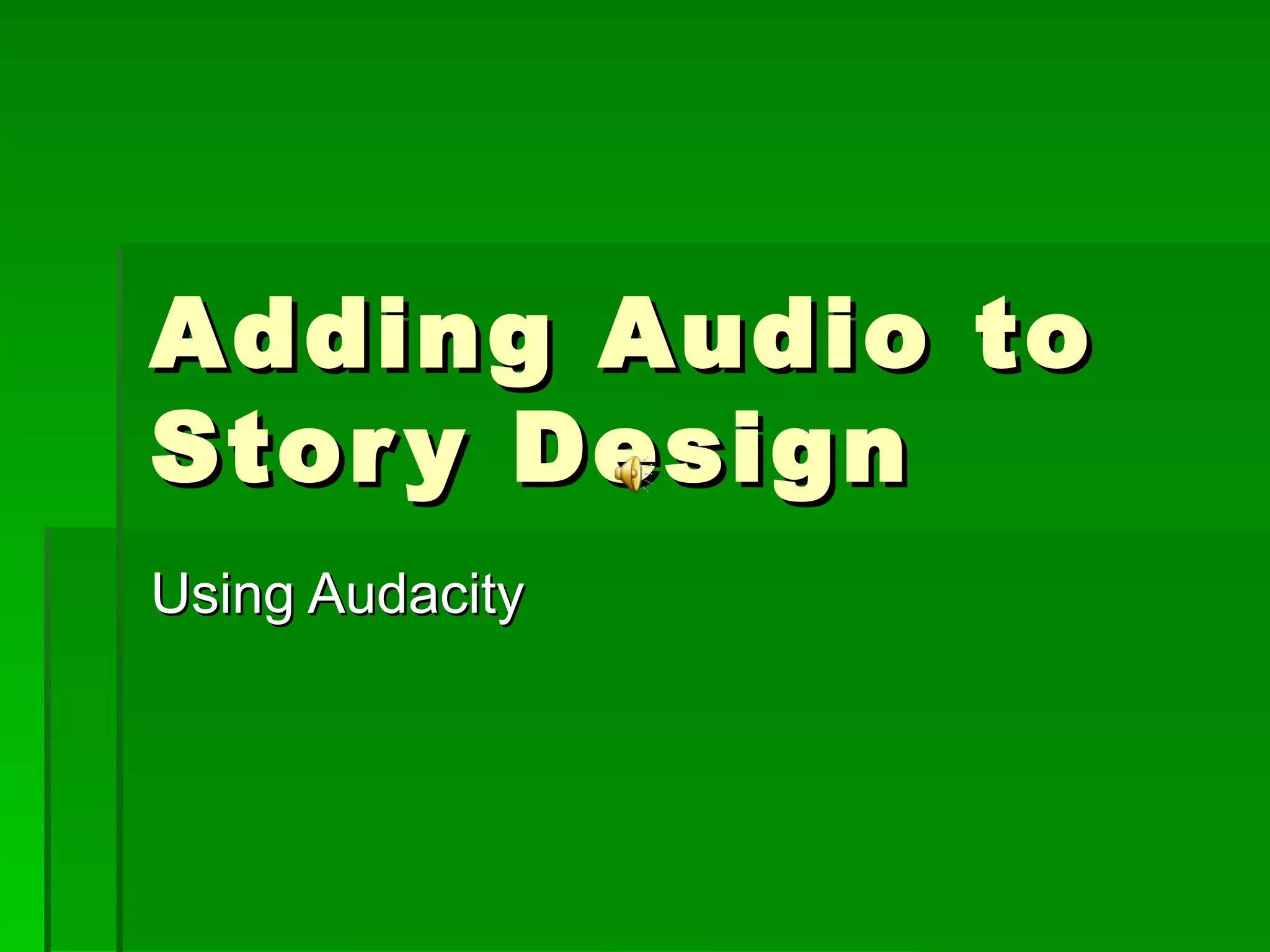 This document provides instructions for adding audio to story design using the audio editing software Audacity. It discusses audio definitions and formats, downloading and using Audacity, the interface and tools, tips for editing audio, and how to save, upload, and embed audio files in WordPress. The document includes links to tutorials and recommends keeping audio clips short, under 3 minutes, and converting files to WAV or MP3 format for web uploading.