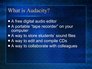 Audacity is a free, open source digital audio editor software that allows users to record, edit, and export audio files. It has basic features like recording, playback, trimming clips, and adjusting volume. The document provides step-by-step instructions on how to download, record, and save an audio file with Audacity that can then be shared by emailing the MP3 file as an attachment. It also lists several ways Audacity can be used for educational purposes like recording lectures, interviews, language lessons, and student presentations.