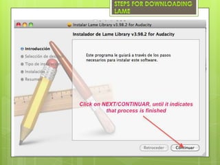 This document provides instructions for using the free audio editing and recording software Audacity to create podcasts. It explains how to download and install both Audacity and LAME, an MP3 encoder. It then walks through the basics of recording and editing audio, including adding music or sound effects, adjusting volume levels, adding fades, and exporting the final audio as an MP3 file. It recommends sharing the finished podcast on Podomatic, a website for hosting podcasts.