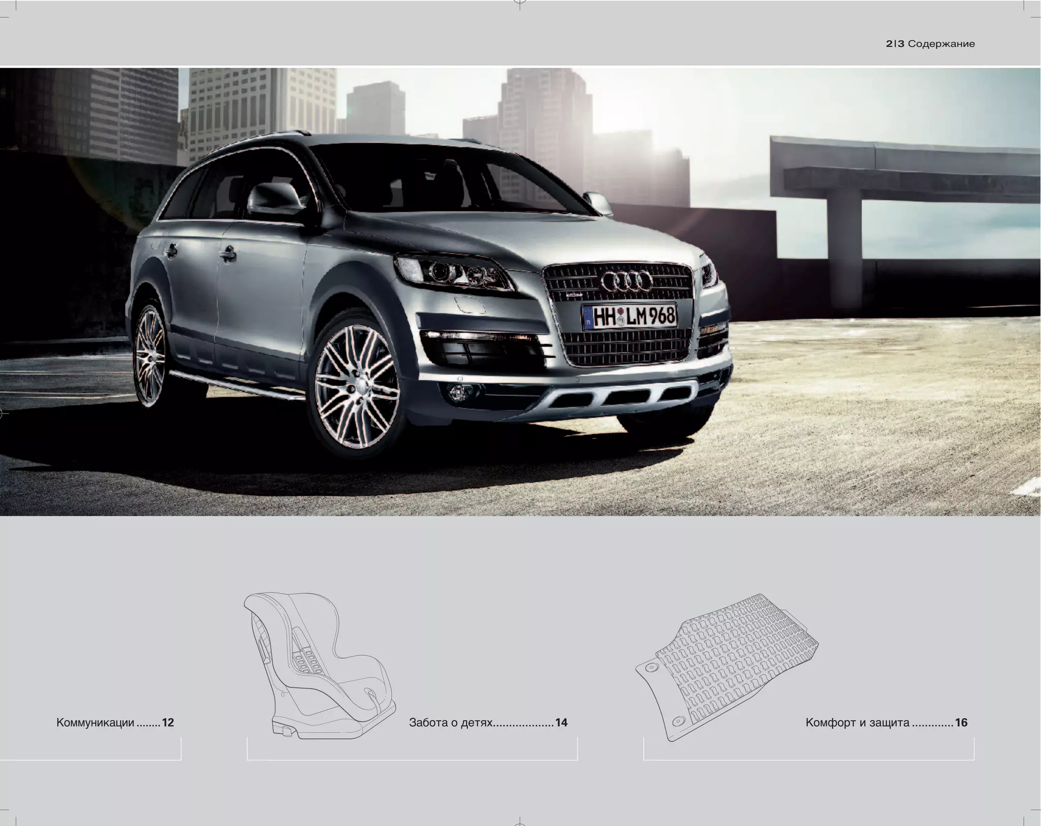 Документ описывает динамический и стильный автомобиль Audi Q7, акцентируя внимание на спортивных аксессуарах, легкосплавных дисках и возможностях индивидуализации. Также рассматриваются различные детские автокресла и дополнительные аксессуары для комфорта и безопасности, включая защитные покрытия и коврики. В нём подчеркивается важность безопасной транспортировки детей и наличие многозадачных решений для перевозки багажа и спортивного инвентаря.