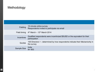 The document presents the findings of a LinkedIn member study in India conducted in March 2014, highlighting the demographics, income, education, and professional influence of Indian LinkedIn users. It indicates that the majority of respondents are affluent, young, and well-educated professionals with significant decision-making authority in their organizations. The findings also show that LinkedIn is a preferred platform for these individuals to engage with professional content and connect with others in their industry.