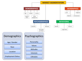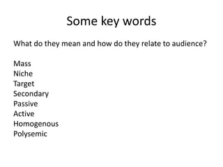 This document discusses key concepts relating to audience in media studies. It defines audience as the people who consume a media product or text. Media texts have intended target audiences that can be mass/mainstream or niche. Audiences can also be passive or active in how they engage with media. The relationship between producers, texts, and audiences affects how meaning is constructed and understood. Demographic details about audiences like age, gender, social class are important to consider. Theories discussed include uses and gratifications theory, which argues media satisfies audience needs and desires, and Stuart Hall's encoding/decoding model of how audiences can interpret meanings differently than intended.