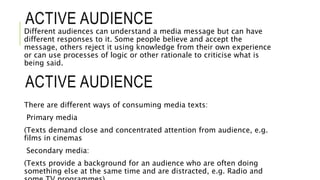 This document summarizes three main theories of how audiences interact with media: