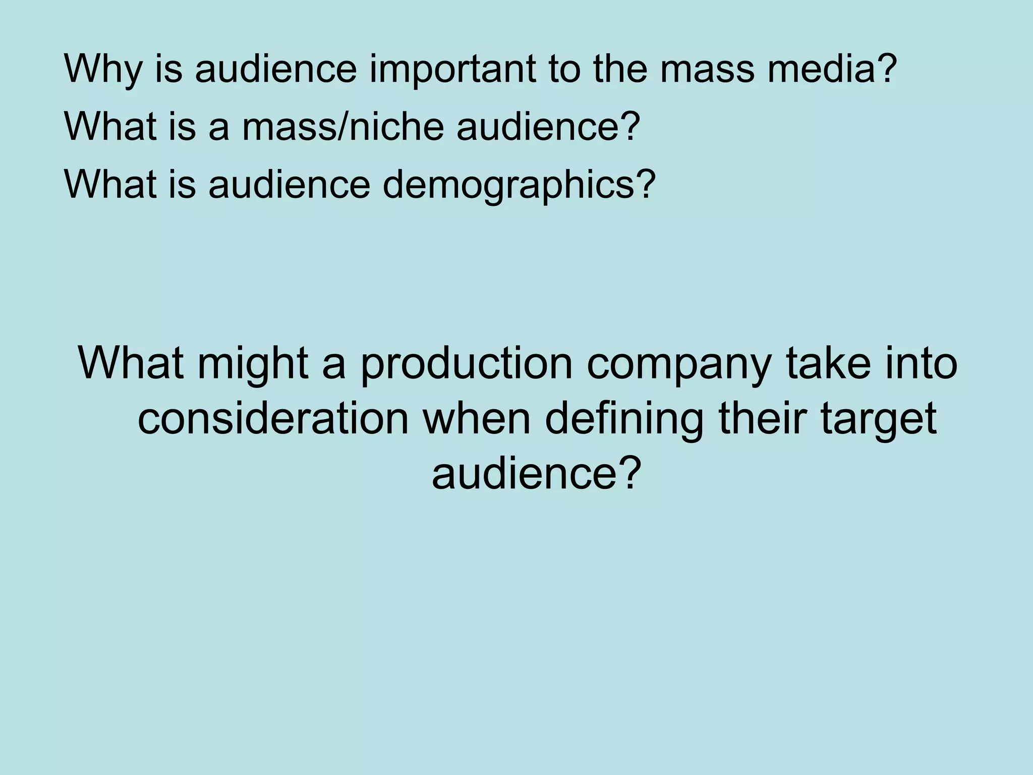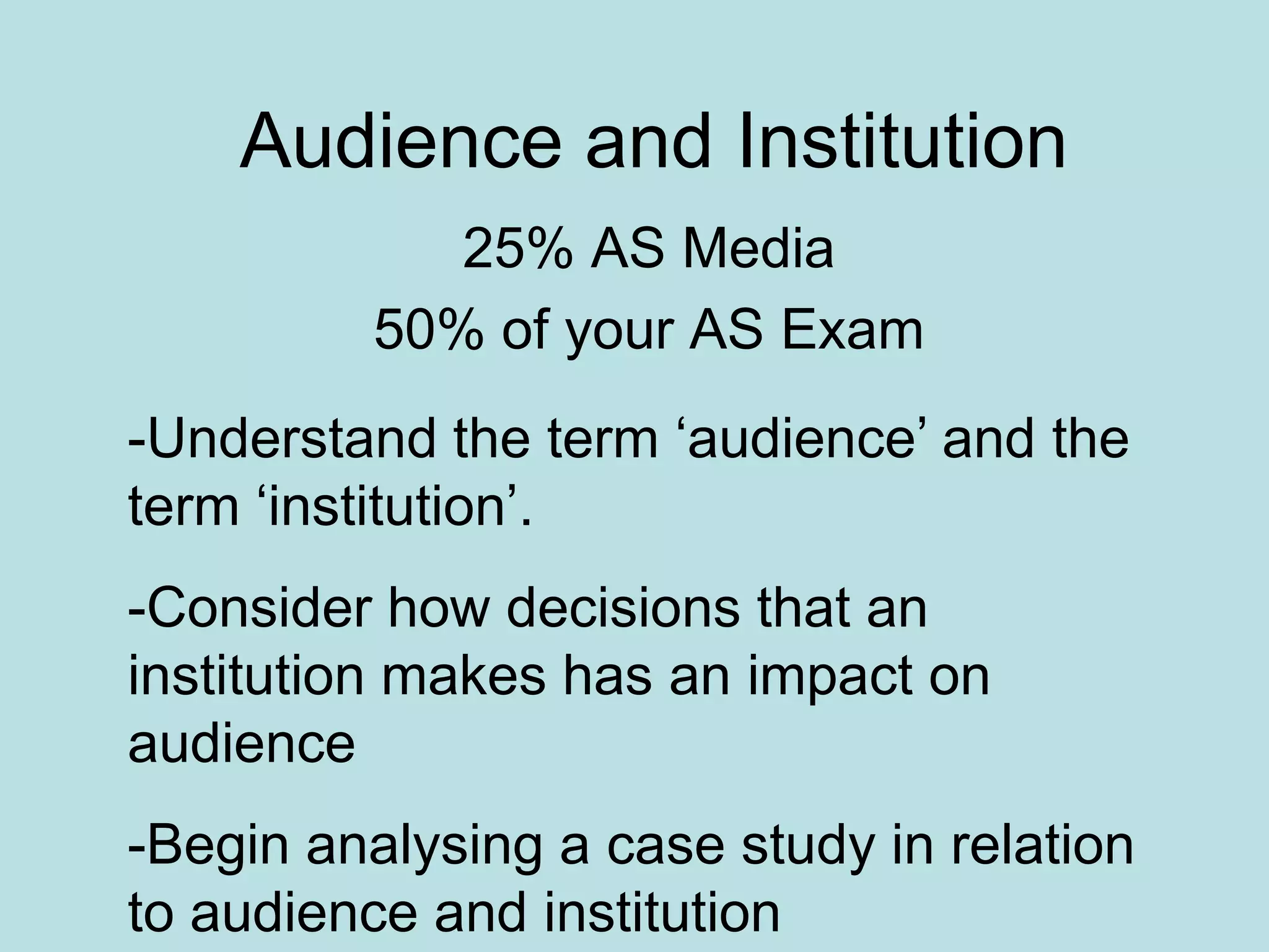 The document discusses the terms "audience" and "institution" and how they relate to mass media. It prompts the reader to consider how an institution's decisions can impact its audience. It also provides questions about audience demographics and what a production company might consider when defining its target audience. The reader is asked to define "institution" and media institutions are described as bodies that create media texts and are influenced by factors like money, ownership, and target audiences. An example of a British film is provided to analyze in relation to these concepts.