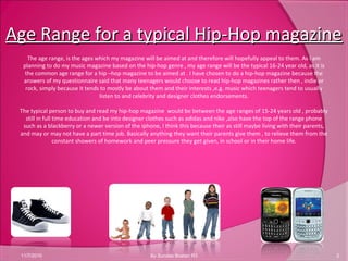 The document discusses the target demographics for a hip-hop magazine. It states that the target age range is 16-24 years old. It also notes that the target audience would be 57% male and 43% female, representing a mixture of black and white readers who are typically still in school. Examples are given of the types of clothing, accessories, and technology that the target audience would be interested in purchasing.
