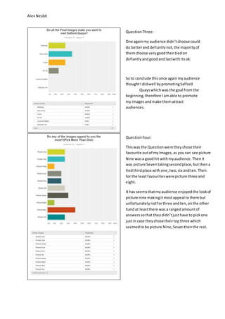 The document summarizes the results of a survey given to an audience about images created by Alex Nesbit. The audience generally thought the images were okay to good in terms of color, that black and white effects were well done, and that the images successfully promoted Salford Quays. Image 9 was the most popular while images 3 and 8 were the least popular. For the least favorite images, there was more variation in responses. The audience responded positively to blur effects but not as strongly as the creator expected.
