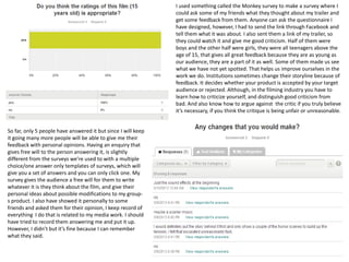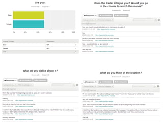 The document discusses using a Monkey survey to get feedback from friends on a trailer. The survey was sent through Facebook to teenagers aged 15 and older, half boys and half girls. Some of the feedback helped spot things not noticed before and will help improve future work. While only 5 people initially responded, keeping the survey open will allow more feedback over time. The survey allows free responses rather than multiple choice to get personal ideas on possible modifications.