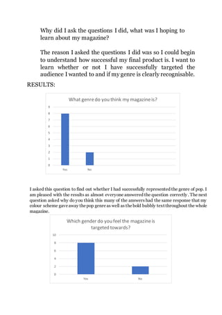 The document summarizes the results of a survey about a magazine and what the creator hoped to learn from asking various questions. Specifically: