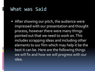The audience provided feedback on the film pitch that suggested some changes be made to improve the story and filmmaking approach. Based on this feedback, the filmmakers decided to scrap some ideas like frequent flashbacks and reduce the number of actors. They also chose to modify shots at the beginning and simplify the plot. However, many original aspects were kept as well. The location and music choices required no changes according to the feedback.