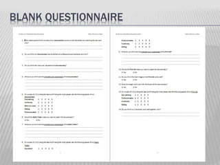 The document provides feedback from audience questionnaires about a documentary, radio trailer, and print ad created by students. The feedback was overwhelmingly positive and found that the products successfully represented the documentary's theme and style, followed professional conventions, and would make viewers want to watch the full documentary. There was some minor negative feedback, but overall the audience felt the products worked well together to promote the documentary.