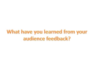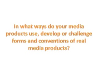 The document summarizes the creative process behind a student music video project for an indie rock band. It describes how the students researched conventions in indie rock music videos, such as slow camera cuts, close-ups, and point-of-view shots. It also discusses the inclusion of instruments, costumes, urban/rural settings, split-screening, and a mix of performance and narrative elements aligned with audience expectations. Overall, the document reflects on how researching comparable music videos and products helped the students understand genre conventions and create a final music video that effectively captured the indie rock aesthetic.