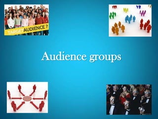 This document discusses three ways to categorize audiences: demographics including age, gender, ethnicity and class; psychographics such as likes and preferences; and categories including professionals, middle management, junior management, skilled manual workers, semi-skilled/unskilled manual workers, and casual workers/pensioners/unemployed. Understanding these audience groups allows one to create a profile of the target audience for a film, program, book or other content.