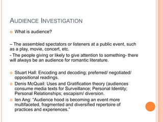 This document discusses audience investigation. It defines audience as spectators or listeners at public events, or those likely to give attention to something. It discusses Stuart Hall's encoding/decoding theory of preferred, negotiated, and oppositional readings by audiences. It also discusses Denis McQuail's uses and gratification theory that audiences consume media for surveillance, identity, relationships, or escapism. Finally, it notes Ien Ang's view that audiences are becoming more multifaceted and diverse in their media experiences.