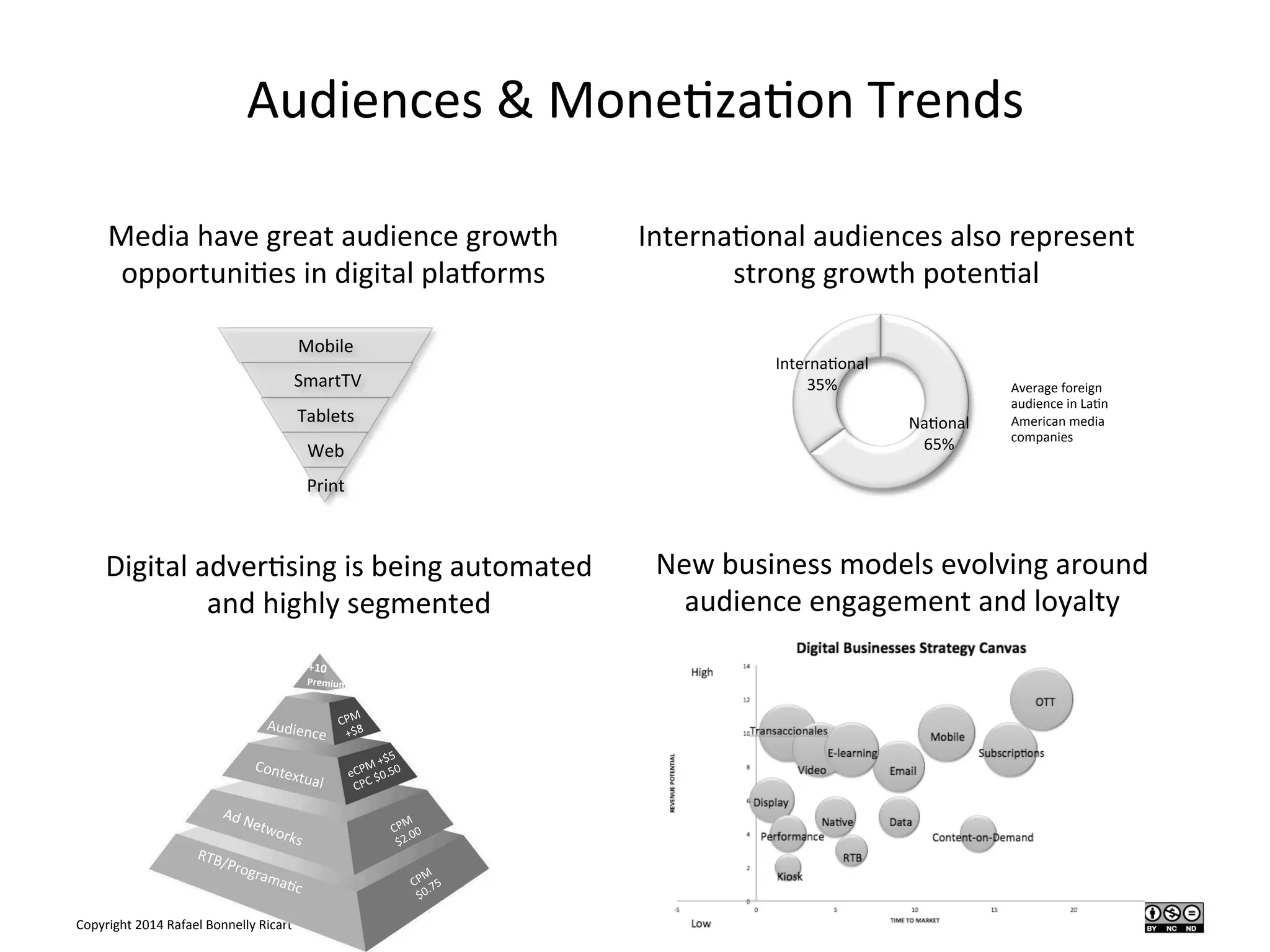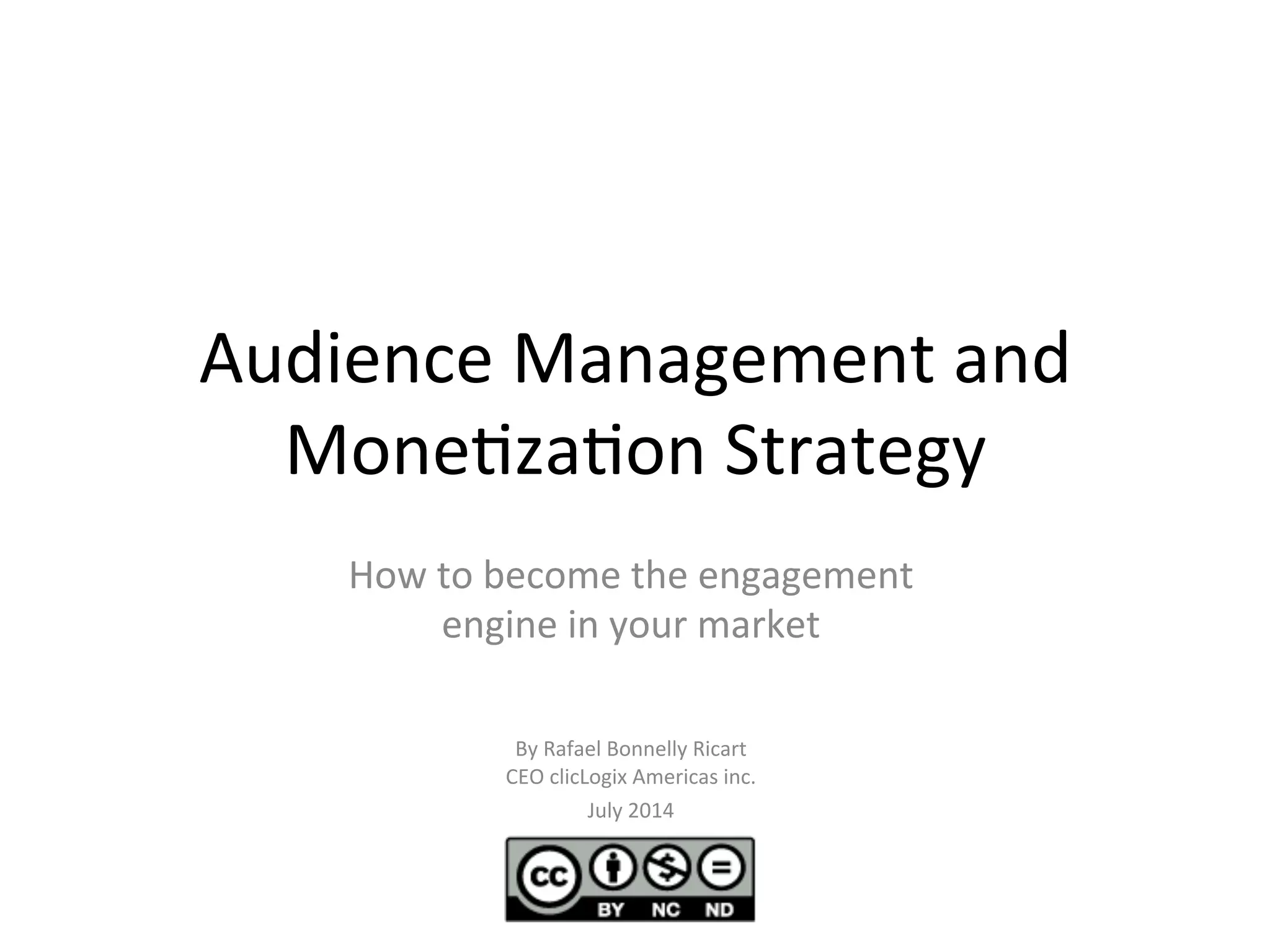 The document discusses strategies for audience management and monetization. It addresses identifying passionate and event-triggered communities, creating engaging multi-platform experiences, and understanding audience aspirations in order to deliver relevant content and surpass expectations. The goal is to establish profitable relationships through advocacy and loyalty by empowering audiences.
