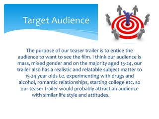 The document discusses targeting audiences for a teaser trailer. It analyzes the target audience as mainly being 15-24 years old as the subject matter around experimenting with drugs, alcohol, and relationships would appeal to that demographic. It also discusses applying Stuart Hall's encoding/decoding theory of media reception - that younger audiences may have a preferred reading of the trailer based on similar lifestyles to the characters, while parents may have a more oppositional reading as they don't want their children influenced by what's shown. Feedback showed the trailer was successful at appealing to the target demographic.