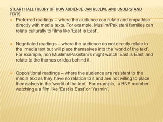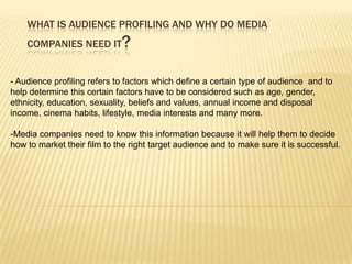 Audience profiling refers to demographic and psychographic factors that define types of audiences. Media companies need to understand their target audiences to effectively market and promote films. Stuart Hall's theory describes how audiences can have preferred, negotiated, or oppositional readings of media texts based on their ability to relate to the content. Our film aims to target 15-25 year old working class individuals who are "strugglers" based on their disadvantaged lifestyle and low annual income. Understanding the audience is important for connecting with them and achieving success.