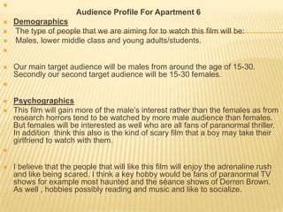 This document provides an audience profile for the film "Apartment 6". It targets males ages 15-30 from lower middle class backgrounds or who are students. Additionally, it may appeal to females ages 15-30 who enjoy paranormal thrillers. The psychographics of the target audience suggest they will like being scared and enjoy adrenaline rushes. Key interests include paranormal TV shows, reading, music, and socializing.