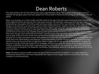 Dean Roberts is a 24-year-old doorman who grew up in East London. He left school at 16 and now enjoys bodybuilding and going out with friends. However, Dean's childhood was difficult due to lack of jobs and money, which led him to get involved with drugs and crime briefly. Now wiser, Dean lives a normal life and enjoys gangster films like Goodfellas and Scarface. The film Hit 'Em Hard aims to appeal to its target male audience aged 18-30 through gritty filming locations in London, typical gangster crime plotlines, and emphasizing gangster stereotypes in marketing.