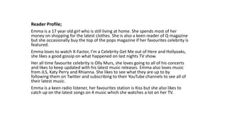 The target audience for this magazine is 16-20 year olds who listen to pop and hip-hop/rap music. They regularly attend concerts and festivals and love to keep up with their favorite artists through music magazines, YouTube, social media like Twitter and Facebook, and the radio. The example reader profile is 17 year old Emma, who enjoys following pop star Olly Murs online and on TV, listens to pop music on the radio, and reads Q magazine for celebrity gossip.