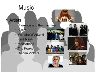 This document profiles Phoebe York's target audience for her song "Forget that I need you". The audience enjoys pop, rock, and indie artists like Florence and the Machine and Vampire Weekend. They attend music festivals like Glastonbury and listen to radio stations like Kiss FM and Radio 1. While technology and shopping are not detailed, music helps this audience feel accepted by others and keep up with popular songs.