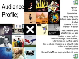 This document profiles a young, creative audience between 16-25 years old who listens to music regularly, particularly indie and alternative genres. They enjoy going to music festivals and concerts, are inspired by bands like Arctic Monkeys and Mumford & Sons, and have interests in both music and fashion as shown by their idolization of music/fashion icons and keeping up with media through magazine reading.